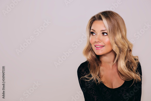 Wonderful woman looking up. Blond curly hair. Surprising facial emotions
