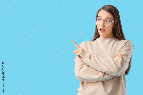 Wondering young woman pointing at something on blue background