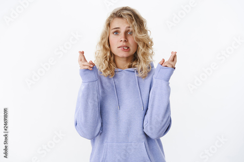 Worried and anxious unconfident cute female student worry about exams biting lower lip nervously, cross fingers for good luck and frowning having high hopes praying for dream come true