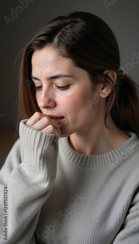Worried Caucasian woman biting her nails, Anxiety Concept