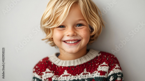 Xmas vibes - cute kid child blonde boy wearing christmas outfit smiling at the camera. Horizontal banner