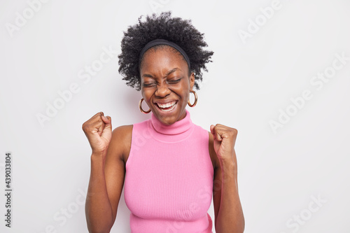 Yes finally. Joyful dark skinned woman makes fist bump achieves goal celebrates victory dressed casually isolated over white background. Carefree young Afro American female triumphs happily.