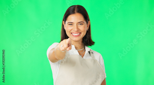 You, green screen and woman pointing for promotion or promo isolated in a studio studio background. Deal, sale and portrait of female showing advertising, marketing and a choice or option