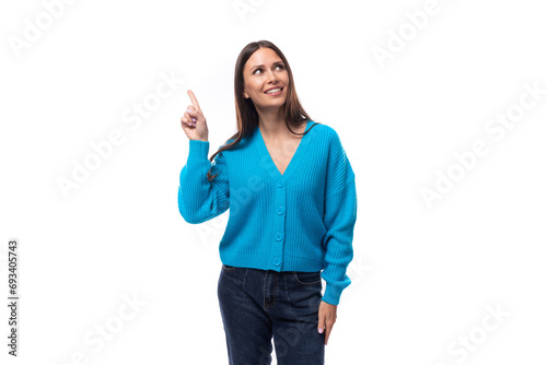 young active caucasian woman with black hair dressed in a blue cardigan and jeans points with her hands to have an idea on a white background