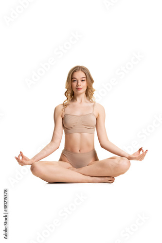 Young adorable woman in underwear sitting on floor isolated over white studio background. Natural beauty concept.