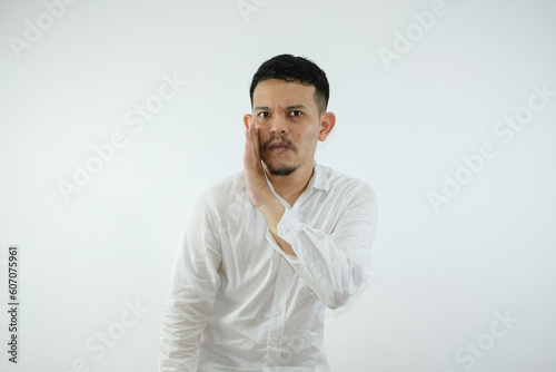Young Adult Asian man whispering something with suspicious expression, or gossipping something