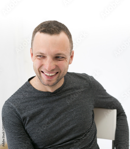 Young adult laughing man is sitting on a chair