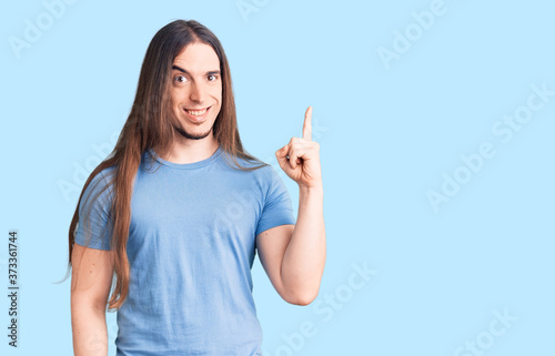 Young adult man with long hair wearing casual clothes pointing finger up with successful idea. exited and happy. number one.