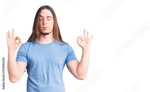 Young adult man with long hair wearing casual clothes relax and smiling with eyes closed doing meditation gesture with fingers. yoga concept.