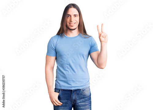 Young adult man with long hair wearing casual clothes smiling with happy face winking at the camera doing victory sign. number two.