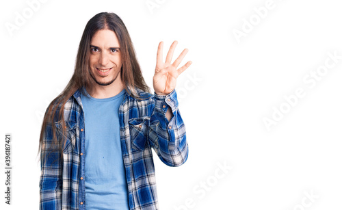 Young adult man with long hair wearing casual shirt showing and pointing up with fingers number four while smiling confident and happy.