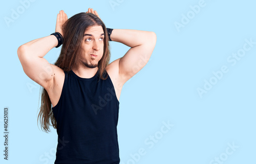 Young adult man with long hair wearing goth style with black clothes doing bunny ears gesture with hands palms looking cynical and skeptical. easter rabbit concept.