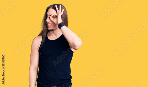 Young adult man with long hair wearing goth style with black clothes doing ok gesture with hand smiling, eye looking through fingers with happy face.
