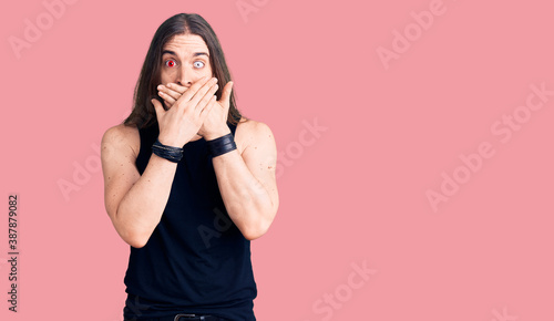 Young adult man with long hair wearing rocker style with black clothes and contact lenses shocked covering mouth with hands for mistake. secret concept.