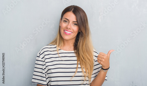 Young adult woman over grunge grey wall wearing navy t-shirt smiling with happy face looking and pointing to the side with thumb up.