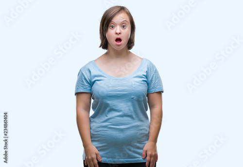 Young adult woman with down syndrome over isolated background afraid and shocked with surprise expression, fear and excited face.