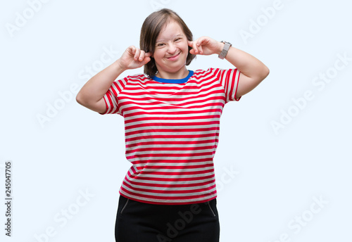 Young adult woman with down syndrome over isolated background covering ears with fingers with annoyed expression for the noise of loud music. Deaf concept.