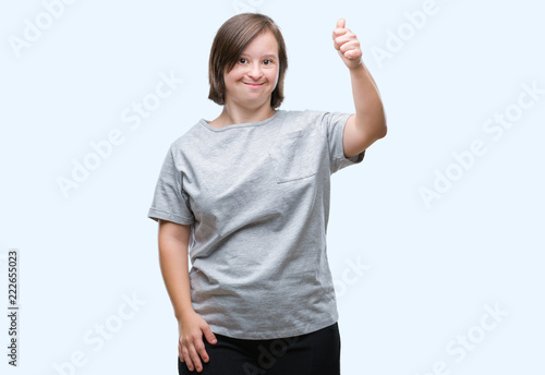 Young adult woman with down syndrome over isolated background doing happy thumbs up gesture with hand. Approving expression looking at the camera with showing success.