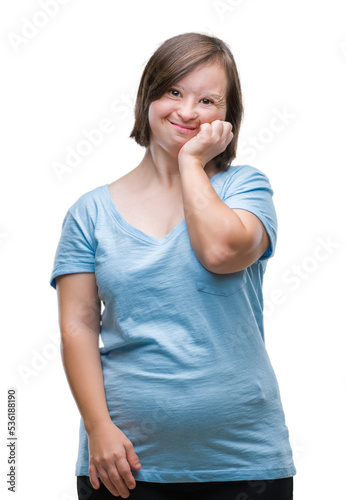 Young adult woman with down syndrome over isolated background looking stressed and nervous with hands on mouth biting nails. Anxiety problem.