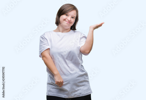 Young adult woman with down syndrome over isolated background smiling cheerful presenting and pointing with palm of hand looking at the camera.
