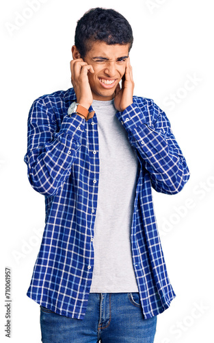 Young african amercian man wearing casual clothes covering ears with fingers with annoyed expression for the noise of loud music. deaf concept.