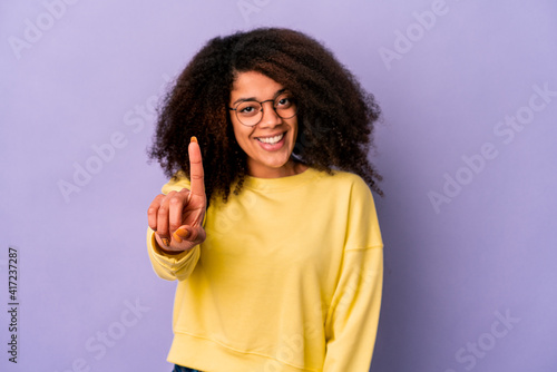 Young african american curly woman isolated on purple background showing number one with finger.