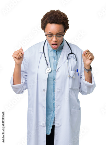 Young african american doctor woman wearing medical coat over isolated background Pointing down with fingers showing advertisement, surprised face and open mouth