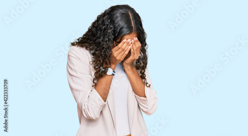 Young african american girl wearing business clothes with sad expression covering face with hands while crying. depression concept.