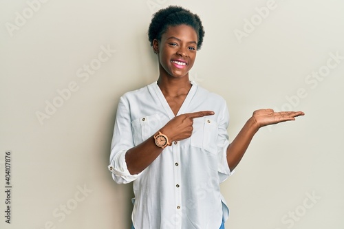 Young african american girl wearing casual clothes amazed and smiling to the camera while presenting with hand and pointing with finger.
