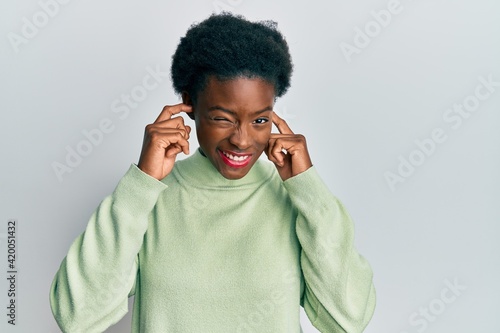 Young african american girl wearing casual clothes covering ears with fingers with annoyed expression for the noise of loud music. deaf concept.