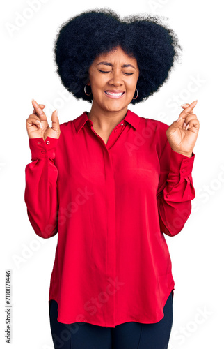 Young african american girl wearing casual clothes gesturing finger crossed smiling with hope and eyes closed. luck and superstitious concept.