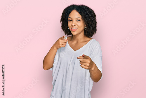 Young african american girl wearing casual clothes pointing fingers to camera with happy and funny face. good energy and vibes.