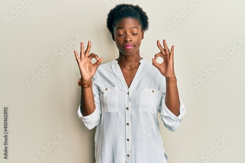 Young african american girl wearing casual clothes relaxed and smiling with eyes closed doing meditation gesture with fingers. yoga concept.