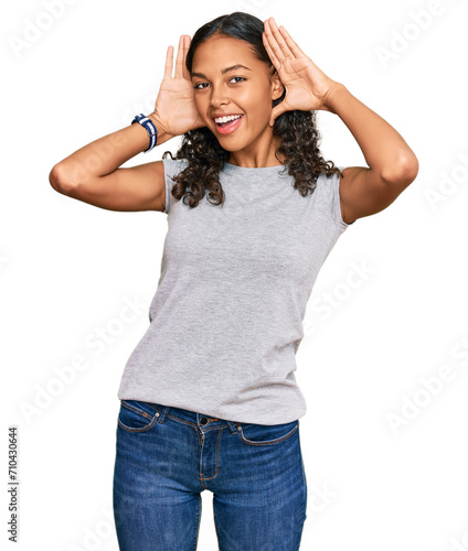 Young african american girl wearing casual clothes smiling cheerful playing peek a boo with hands showing face. surprised and exited