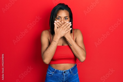 Young african american girl wearing casual style with sleeveless shirt shocked covering mouth with hands for mistake. secret concept.