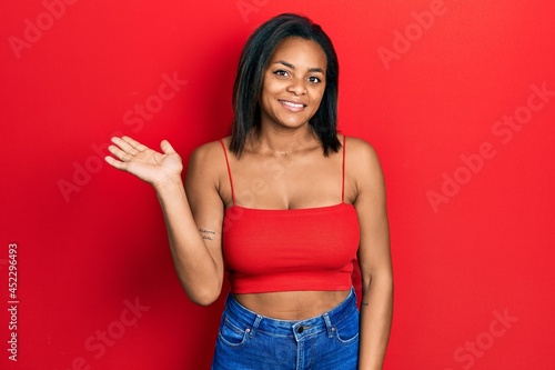 Young african american girl wearing casual style with sleeveless shirt smiling cheerful presenting and pointing with palm of hand looking at the camera.