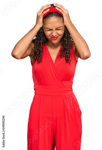 Young african american girl wearing elegant and sexy look suffering from headache desperate and stressed because pain and migraine. hands on head.