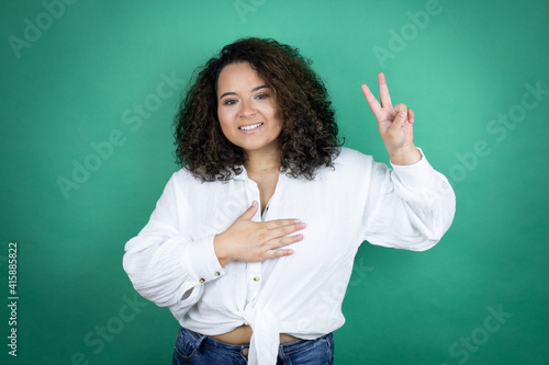 Young african american girl wearing white shirt over green background smiling swearing with hand on chest and fingers up, making a loyalty promise oath