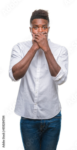 Young african american man over isolated background shocked covering mouth with hands for mistake. Secret concept.