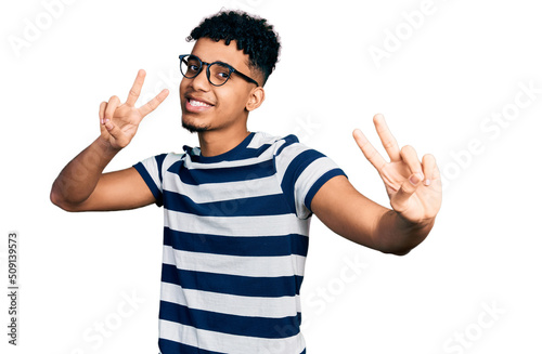 Young african american man wearing casual clothes and glasses smiling looking to the camera showing fingers doing victory sign. number two.