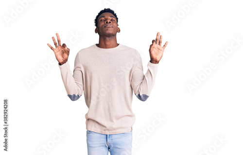 Young african american man wearing casual clothes relax and smiling with eyes closed doing meditation gesture with fingers. yoga concept.