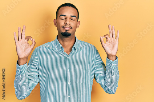 Young african american man wearing casual clothes relax and smiling with eyes closed doing meditation gesture with fingers. yoga concept.