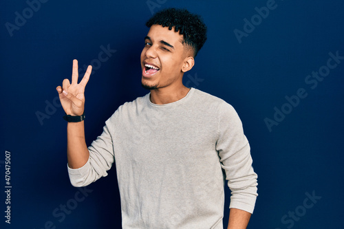 Young african american man wearing casual clothes smiling with happy face winking at the camera doing victory sign. number two.