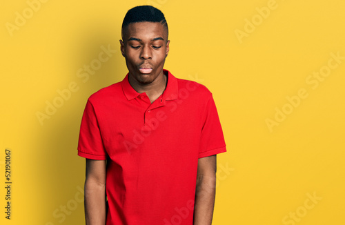 Young african american man wearing casual red t shirt making fish face with lips, crazy and comical gesture. funny expression.