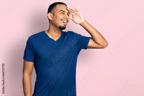 Young african american man wearing casual t shirt very happy and smiling looking far away with hand over head. searching concept.
