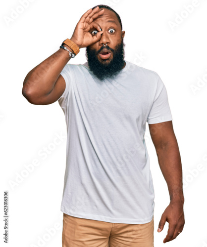 Young african american man wearing casual white tshirt doing ok gesture shocked with surprised face, eye looking through fingers. unbelieving expression.