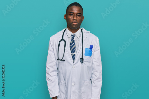 Young african american man wearing doctor uniform and stethoscope with serious expression on face. simple and natural looking at the camera.