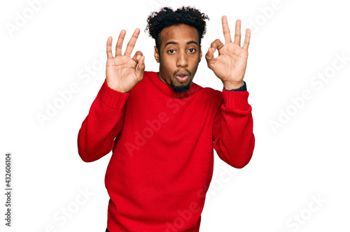 Young african american man with beard wearing casual winter sweater looking surprised and shocked doing ok approval symbol with fingers. crazy expression