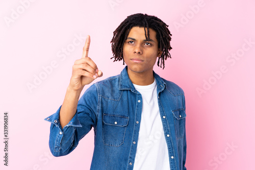 Young African American man with jean shirt over isolated pink background touching on transparent screen