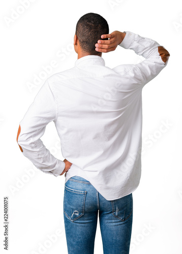 Young african american man with white shirt on back position looking back while scratching head on isolated white background